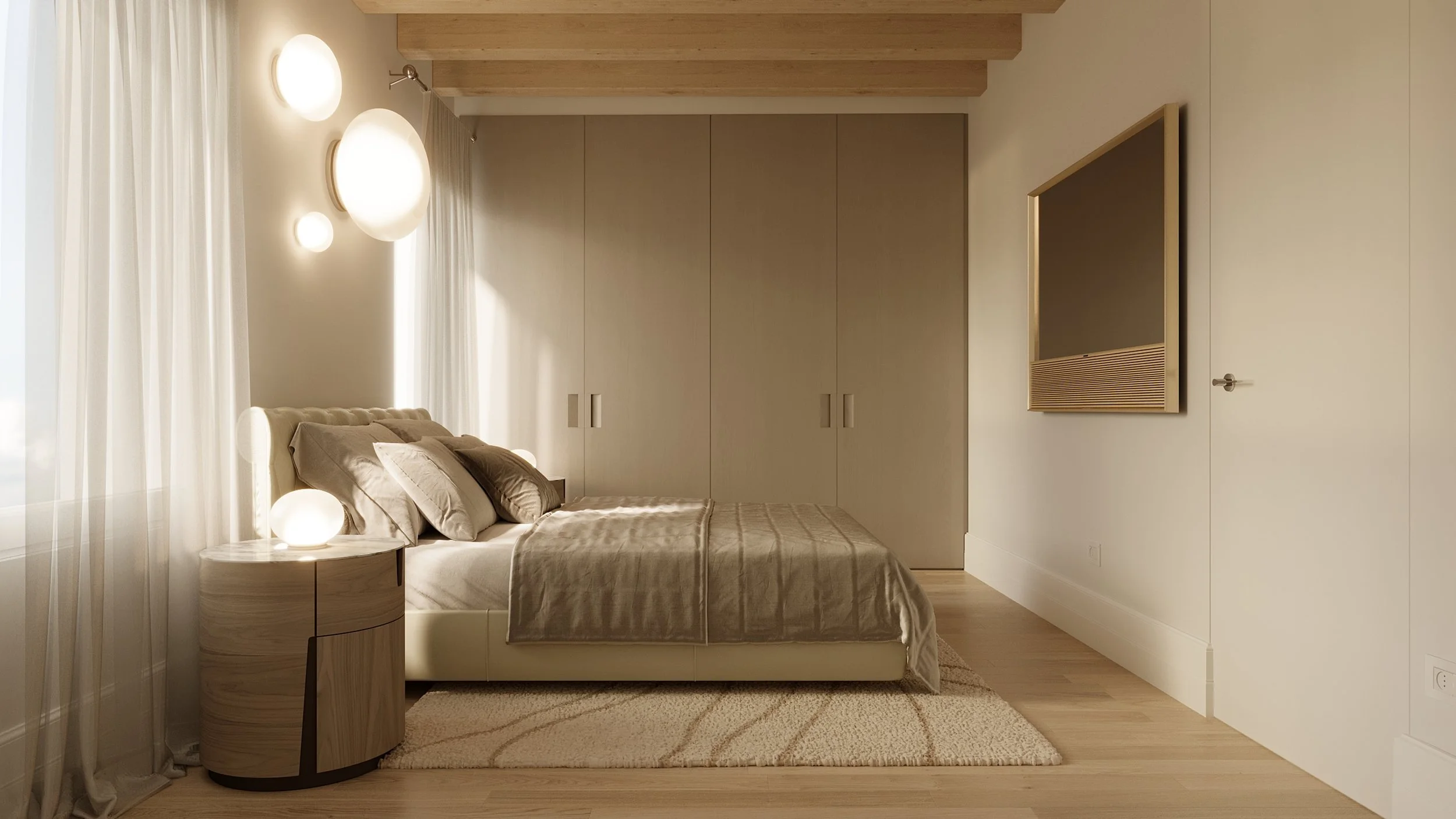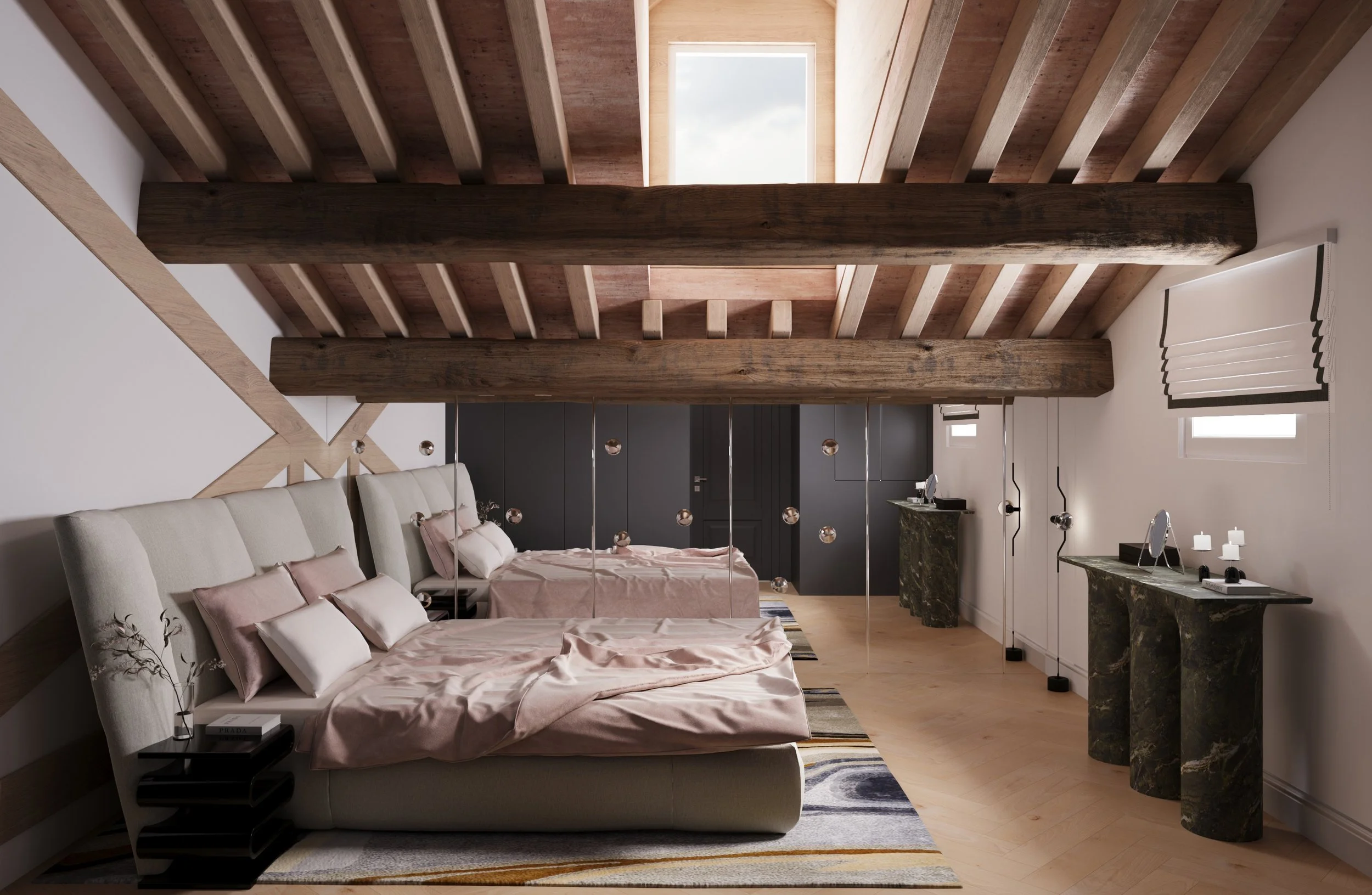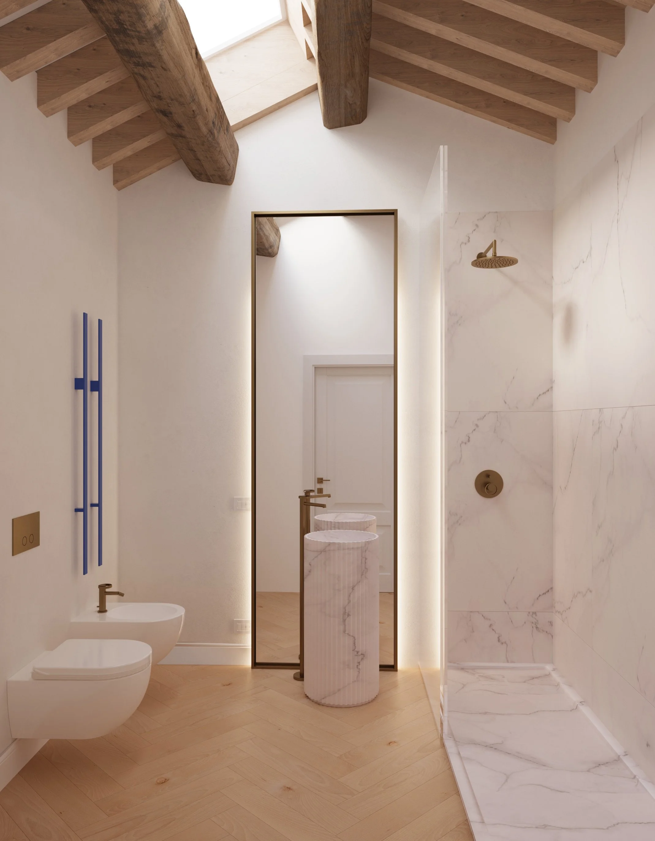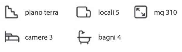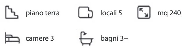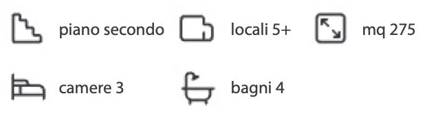 Suite padronale con bagno wellness e cabina armadio, più due camere con bagno. Incantevoli corti private e disponibilità di garage e cantina su richiesta.