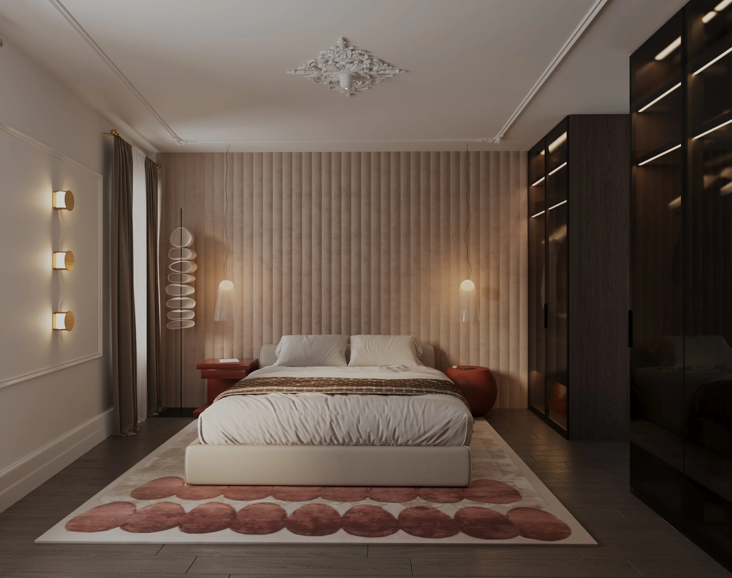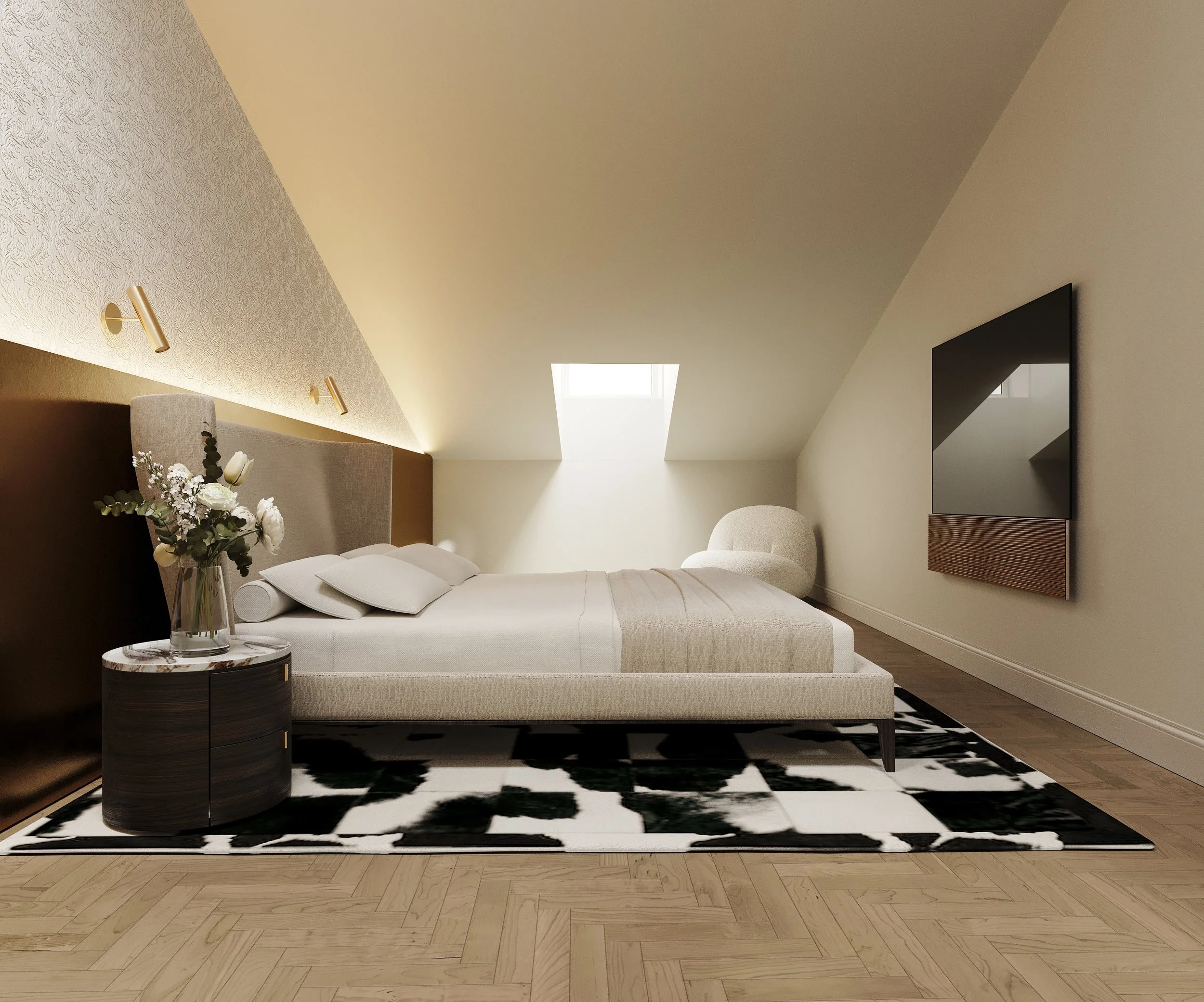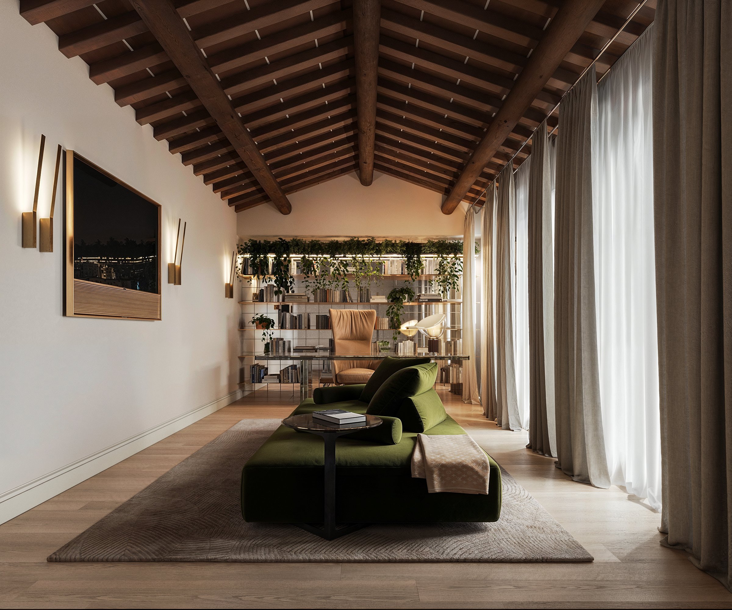 Elegante abitazione all’ultimo piano con ingresso, soggiorno-pranzo e due deliziose terrazzine interne, cucina separata, stireria, bagno e lavanderia. La zona notte ospita una suite padronale con bagno e ampia cabina armadi, oltre a due camere ciascuna con bagno.
